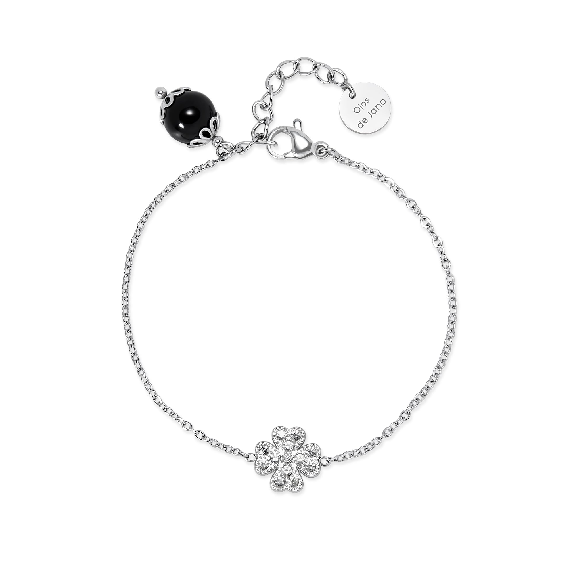 Bracciale in acciaio inossidabile, Su Kokku misura 8 mm in acciaio inossidabile, quadrifoglio centrale in acciaio inossidabile e zirconi bianchi.